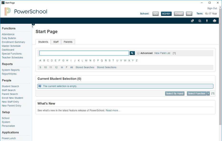 Quick School turns the school selection drop-down into a series of buttons. In the Setup > Personalize > Interface screen, individual users have the ability to: