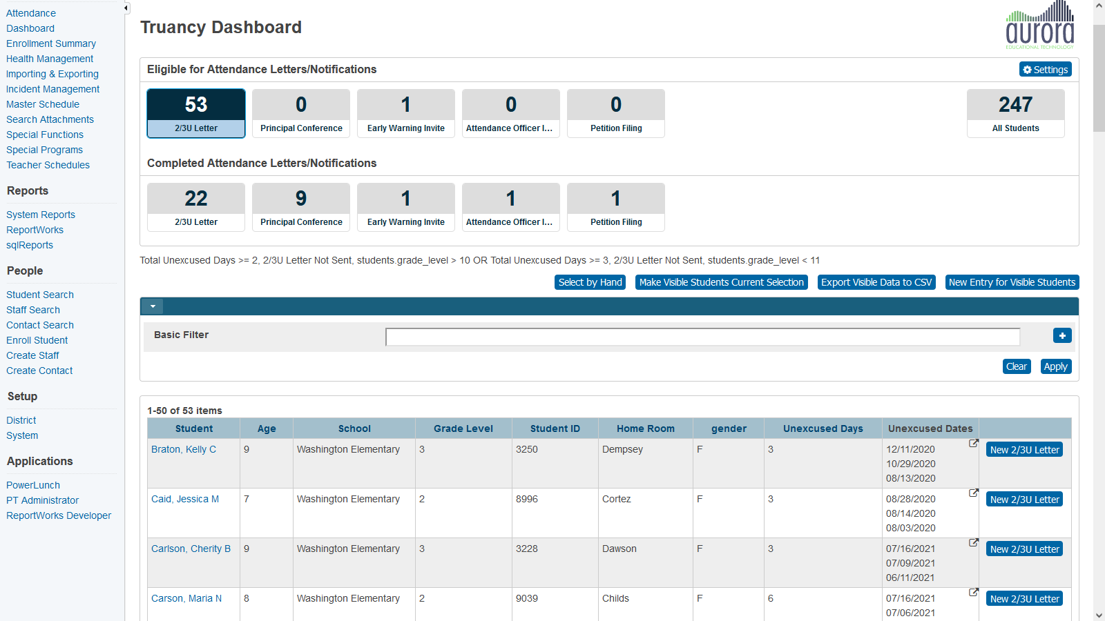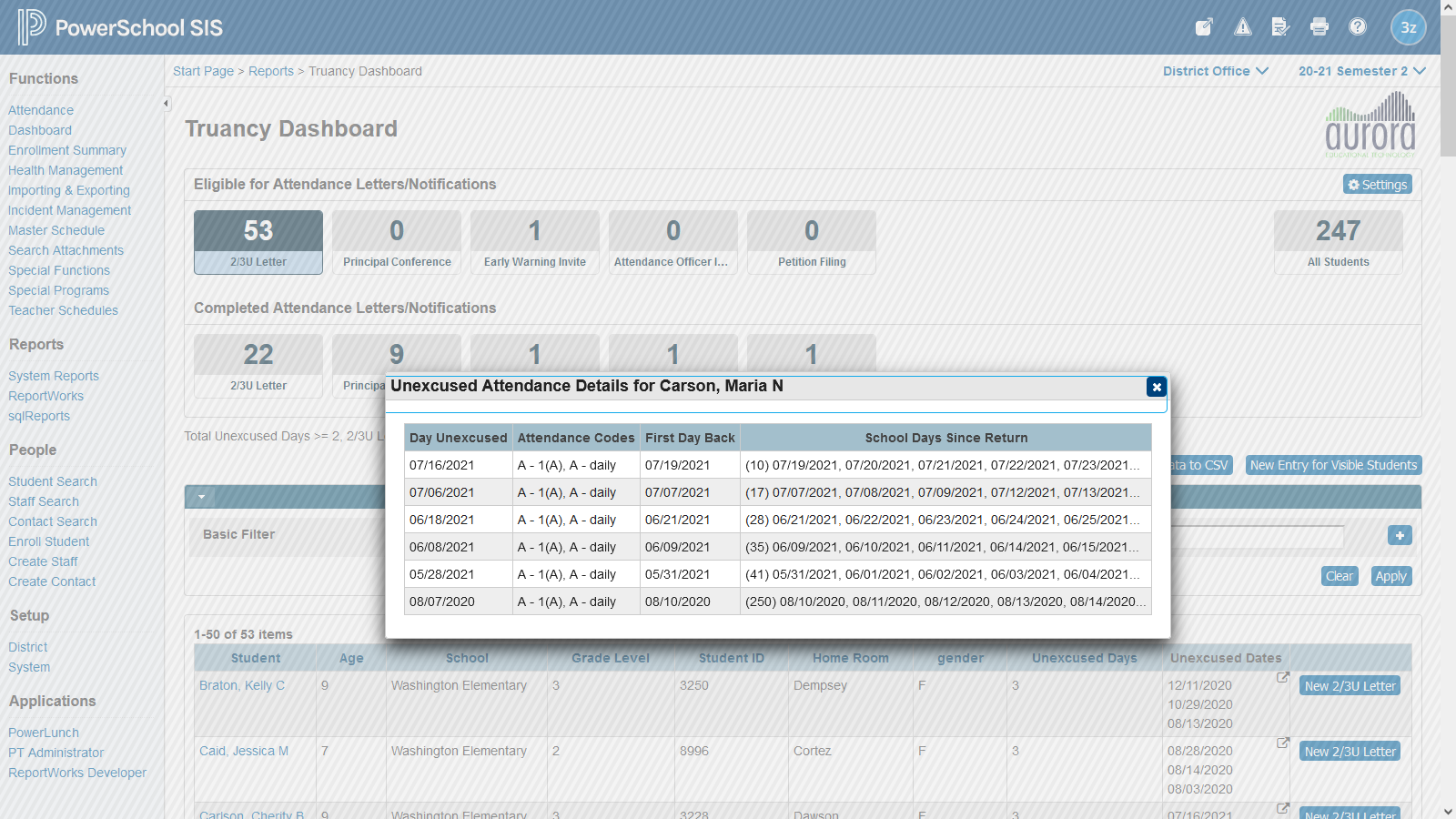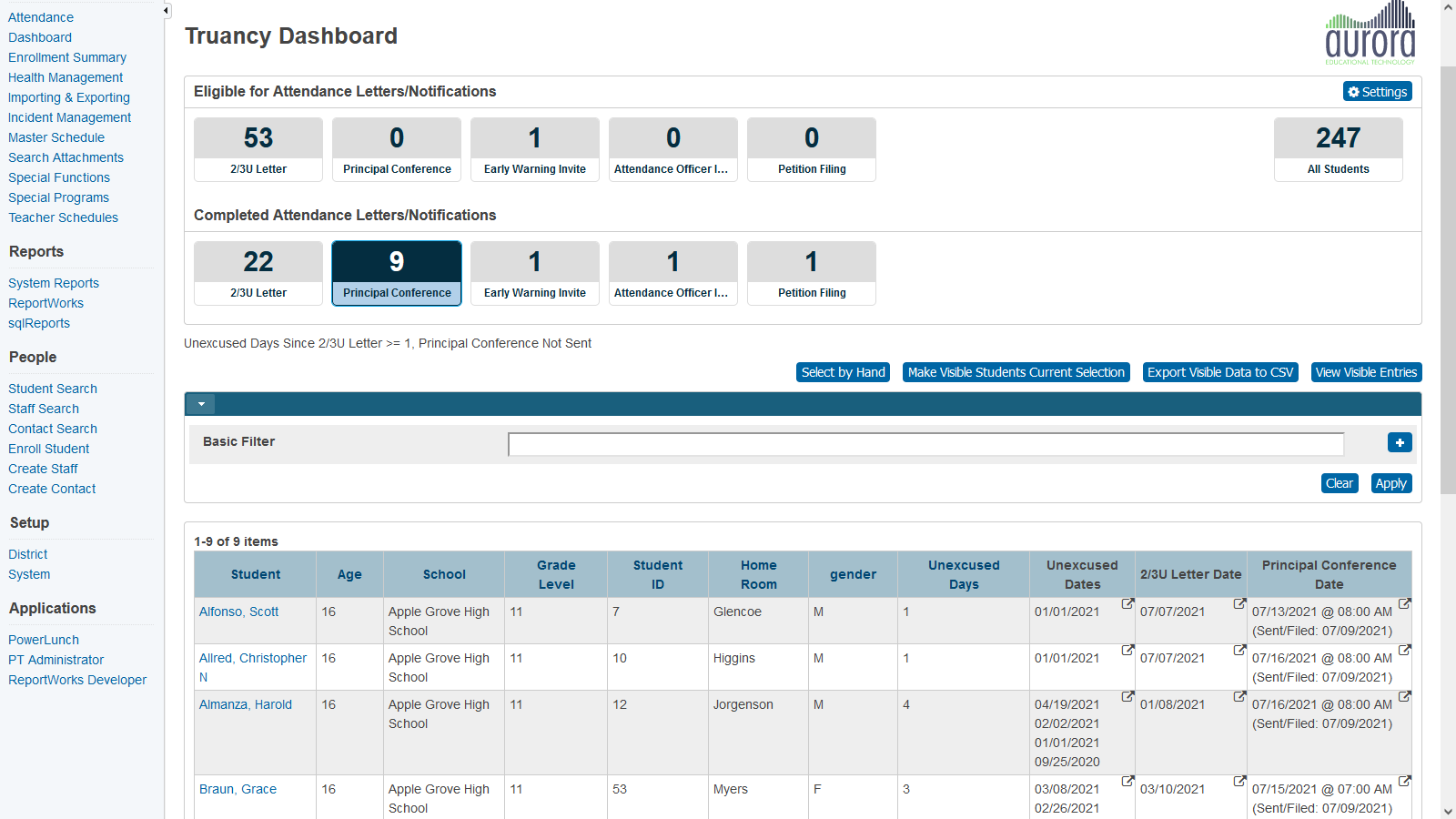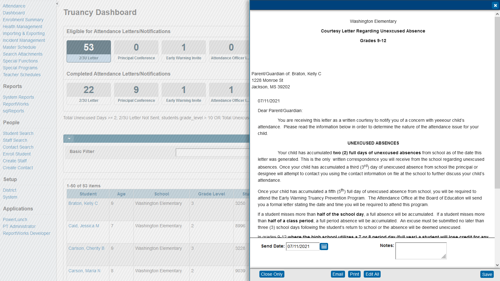 Truancy Dashboard is designed to make truancy identification, notification, and intervention documentation a breeze. This plugin seamlessly embeds into PowerSchool and provides a single screen for attendance officers to complete their tasks. Every aspect of the Truancy Dashboard is customizable and does not require expensive or time-consuming customization.